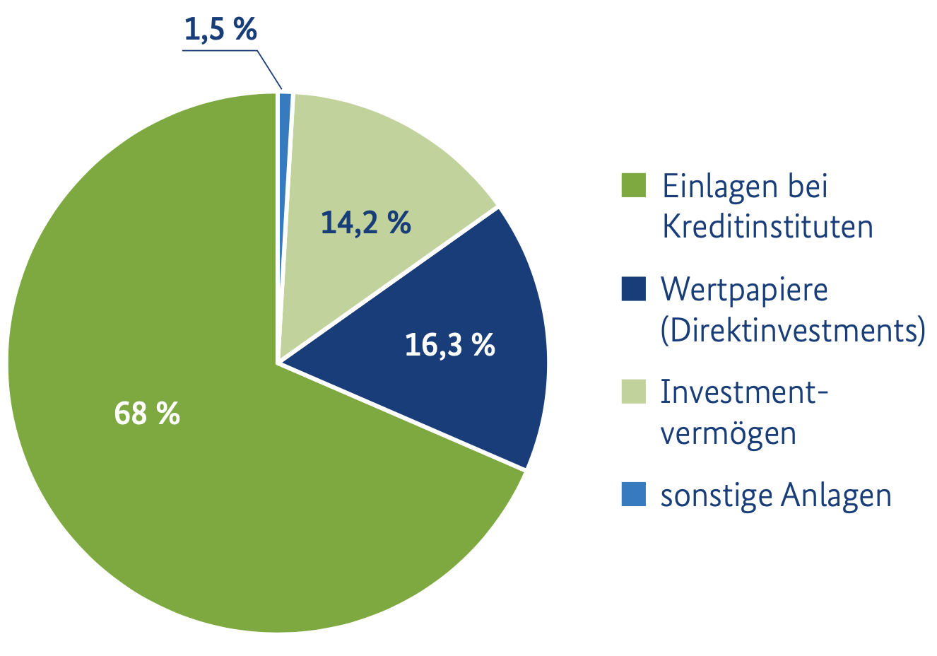 Laut Report verfügten die bundesunmittelbaren Sozialversicherungsträger zum Stichtag 31.12.2023 über insgesamt 87,6 Milliarden Euro an liquiden Mitteln, die zu 68 Prozent (ca. 60 Milliarden Euro) als Einlagen bei Kreditinstituten verwaltet wurden. 14,3 Milliarden Euro (16,3 Prozent) wurden in Wertpapiere (Direktinvestments) und 12,5 Milliarden Euro (14,2 Prozent) in Investmentvermögen angelegt. Der Rest (0,8 Milliarden Euro) entfiel auf sonstige Anlagen.